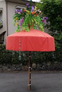 花傘を先頭に風流の装いを凝らして、鉦や太鼓をたたき、踊りながら氏子区域をくまなく練り歩き疫病をおさめます。