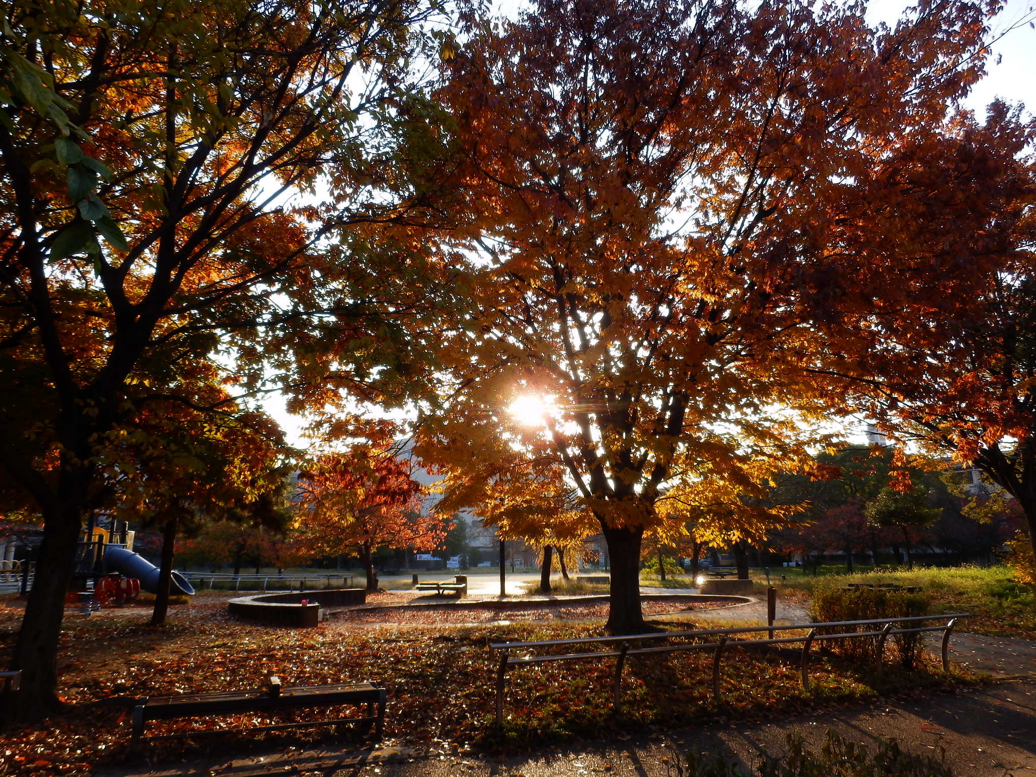 誰もいない公園で朝日を浴びて輝いていました。