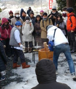 神社では餅つきとぜんざいのふるまいが行われていて、大勢の人が並んでいて驚きました。