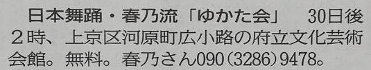 【お知らせ】京都新聞朝刊に「春乃流 ゆかた会」が掲載されました 2019/06/28 6月27日(木)の京都新聞朝刊 25面の情報ワイド 催しにて 「春乃流 ゆかた会」が掲載されました。 あと数日でゆかた会です。 門下生の稽古の成果を たくさんの方に見ていただければ嬉しいです。 お時間のある方はぜひお越しください。 FacebookTwitter