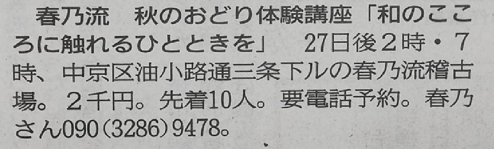 【お知らせ】京都新聞朝刊に「春乃流 秋のおどり体験」が掲載されました 2019/09/15 9月13日(金)の京都新聞朝刊 23面の情報ワイド 学ぶにて 「春乃流 秋のおどり体験」が掲載されました。 申し込み受付中です。 興味のある方は、ご連絡ください。 FacebookTwitter