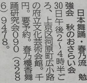 【お知らせ】京都新聞朝刊に「春乃流 勉強会 秋のおさらい会」が掲載されました