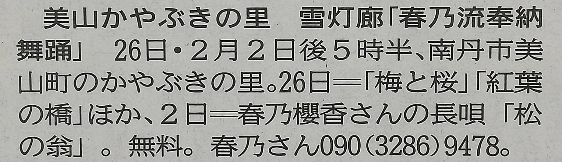 【お知らせ】京都新聞朝刊に「美山かやぶきの里 雪灯廊」が掲載されました 2019/01/25 昨日、1月24日(木曜日)の京都新聞朝刊 27面の情報ワイド 催しに記事が掲載されました。 春乃流は17時30分から 知井八幡神社にて舞踊を奉納させていただきます。 皆様のお越しをお待ちしております。 FacebookTwitter