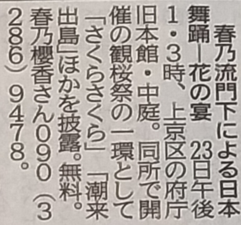 【お知らせ】京都新聞朝刊に「観桜祭 春乃流による日本舞踊」が掲載されました