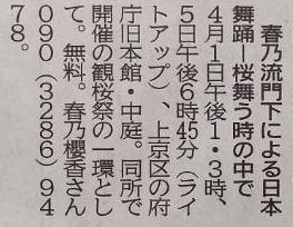 【お知らせ】京都新聞朝刊に「観桜祭 春乃流による日本舞踊」が掲載されました 2023/03/30 3月29日(水曜日)の京都新聞朝刊 22面のまちかど イベントで 「観桜祭 春乃流による日本舞踊」が掲載されました。 本番まであと数日になりました。 出演する門下生一同稽古に励んでおります。 たくさんの方のお越しをお待ちしております。 FacebookTwitter