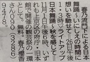 【お知らせ】京都新聞朝刊に「観芸祭 春乃流による日本舞踊」が掲載されました 2024/10/23 10月22日(火曜日)の京都新聞朝刊 18面のまちかど イベントにて 「観芸祭 春乃流による日本舞踊」が掲載されました。 皆様のお越しをお待ちしております。 FacebookTwitter