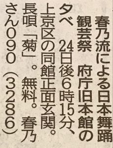 【お知らせ】京都新聞朝刊に「観芸祭 府庁旧本館の夕べ」が掲載されました 2018/10/21 昨日、10月20日(土曜日)の京都新聞朝刊 24面のまちかどイベントコーナーに記事が掲載されました。 春乃流は6時15分から 正面玄関 車寄せで舞踊披露いたします。 観芸祭でのライトアップは初めての催しですが たくさんの方に見ていただければ嬉しいです。 お時間のある方はぜひお越しください。 FacebookTwitter