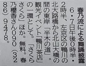 【お知らせ】京都新聞朝刊に「鴨川茶店」が掲載されました 2024/04/02 4月1日(月曜日)の京都新聞朝刊 28面のまちかど イベントにて 「鴨川茶店」が掲載されました。 皆様のお越しをお待ちしております。 FacebookTwitter