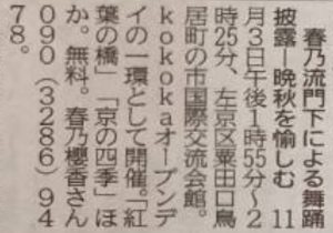 【お知らせ】京都新聞朝刊に「kokoka オープンデイ」が掲載されました 2023/10/30 10月28日(土曜日)の京都新聞朝刊 18面まちかど イベントにて 「kokoka オープンデイ」が掲載されました。 皆様のお越しをお待ちしております。 FacebookTwitter