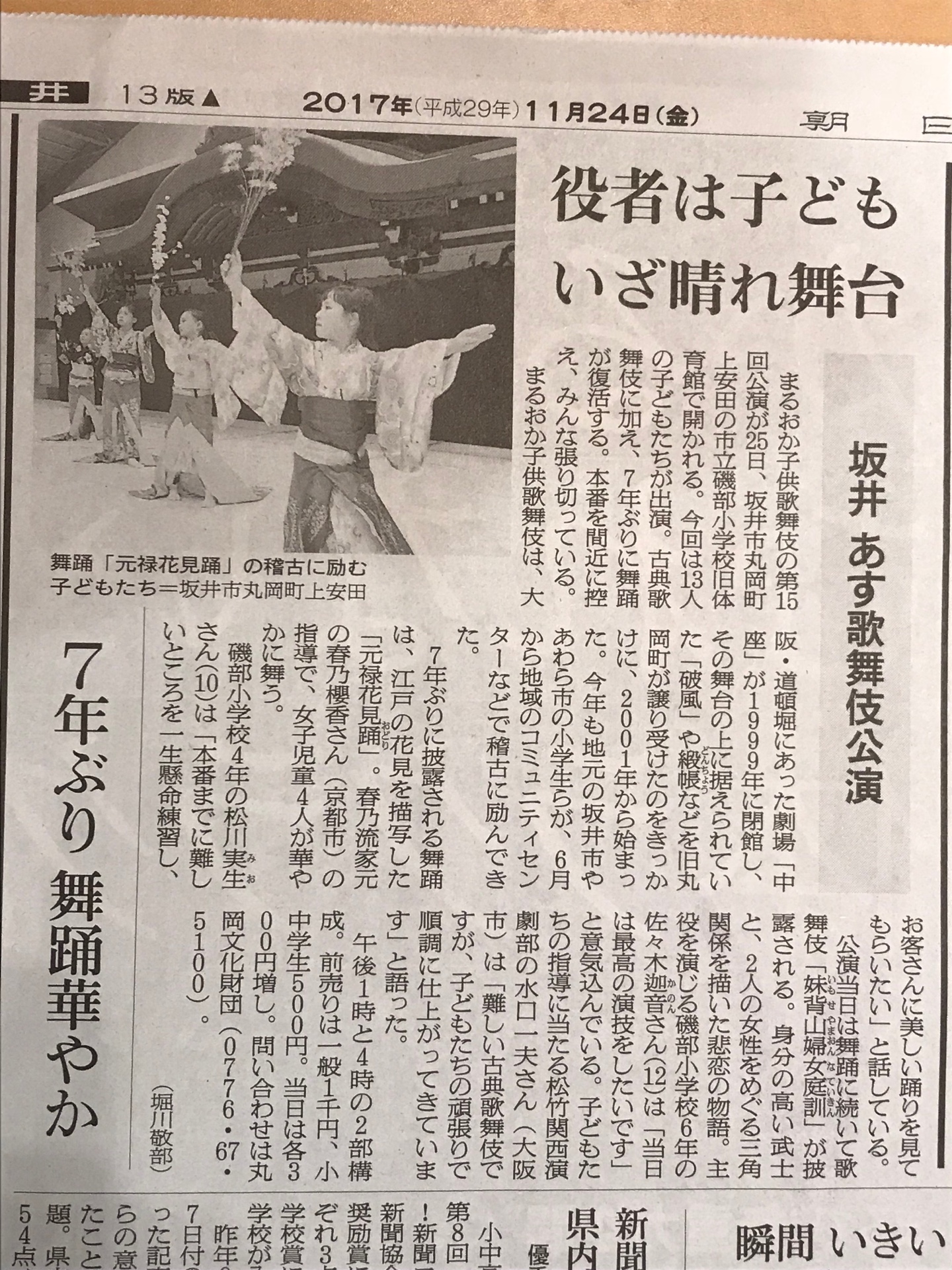 【お知らせ】朝日新聞朝刊に「まるおか子供歌舞伎」が掲載されました 2017/11/24 本日、11月24日(金曜日)の 朝日新聞朝刊に 福井県の磯部小学校で行われる こども歌舞伎のお稽古風景が掲載されました。 家元 春乃櫻香の指導のもと 児童4名が舞踊「元禄花見踊」のお稽古に励んでいます。 明日、11月25日(土曜日)に 披露されます! 皆さんのお稽古の成果を楽しみにしています。 頑張ってください。 門下一同、応援しております。 FacebookTwitter