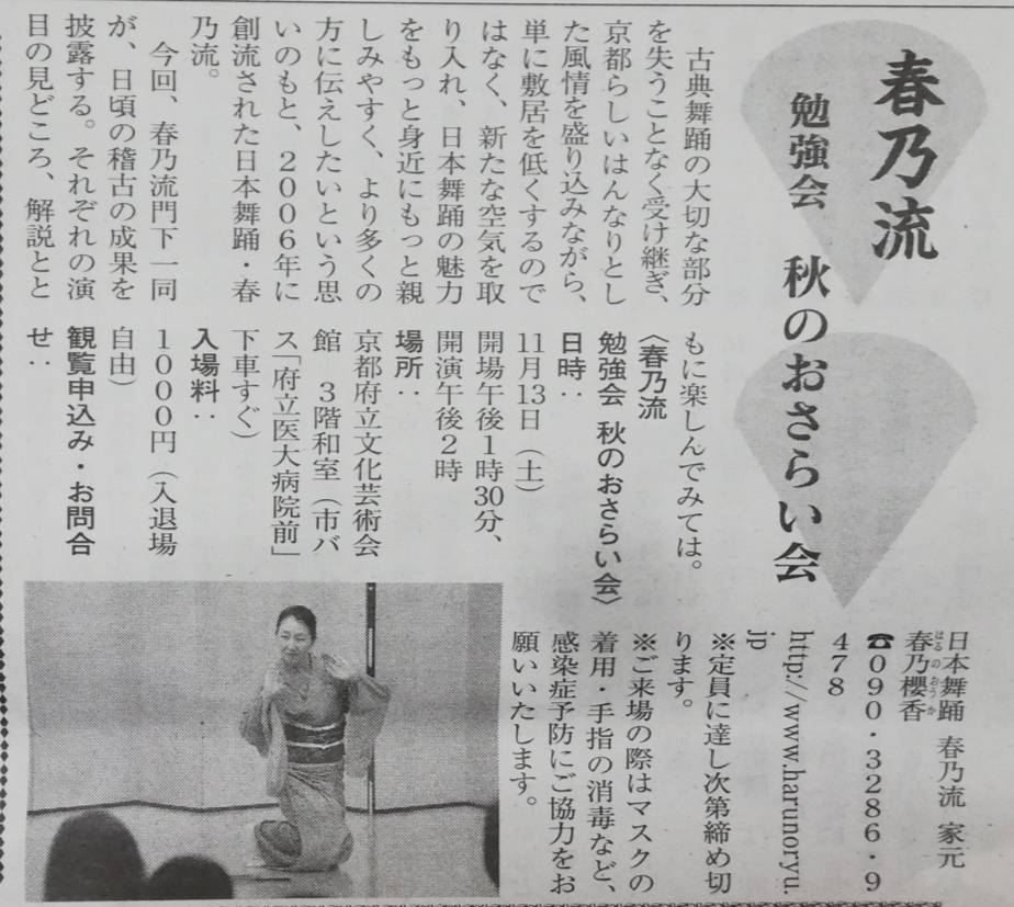 【お知らせ】MK新聞11月号に「春乃流 勉強会 秋のおさらい会」が掲載されました 2021/11/05 11月1日(月曜日)発行の MK新聞(第904号)6面に 「春乃流 勉強会 秋のおさらい会」が掲載されました。 門下生が日頃の稽古の成果を披露いたします。 それぞれの演目の見所や解説もありますので、日本舞踊と共にそちらもお楽しみください。 皆様のお越しをお待ちしております。 FacebookTwitter
