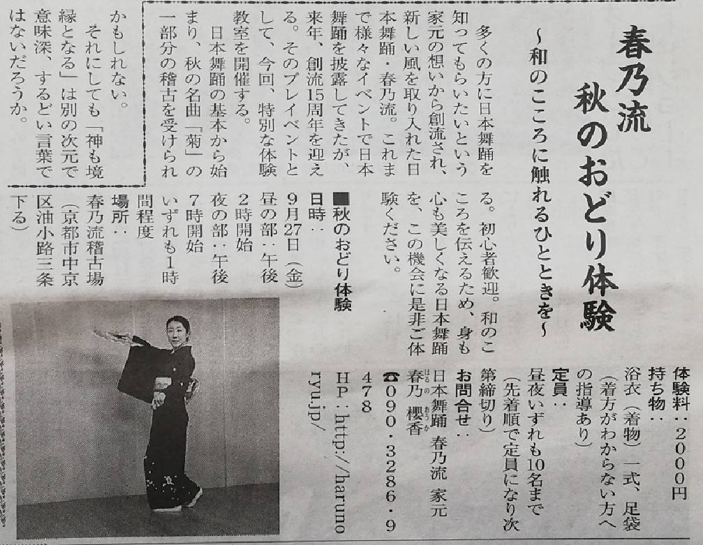 【お知らせ】MK新聞9月号に「春乃流 秋のおどり体験」が掲載されました 2019/09/12 9月1日(日曜日)発行の MK新聞(第878号)3面に 「春乃流 秋のおどり体験」が掲載されました。 ご興味のある方はぜひ、ご連絡ください。 FacebookTwitter
