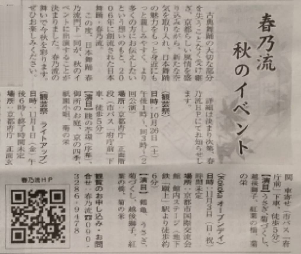 【お知らせ】MK新聞9月号に秋のイベントが掲載されました 2024/09/13 9月1日(日曜日)発行の MK新聞(934号)9面に 「京都府庁旧本館 観芸祭」と「京都府庁旧本館 観芸祭 ライトアップ」と 「kokoka オープンデイ」が掲載されました。 FacebookTwitter