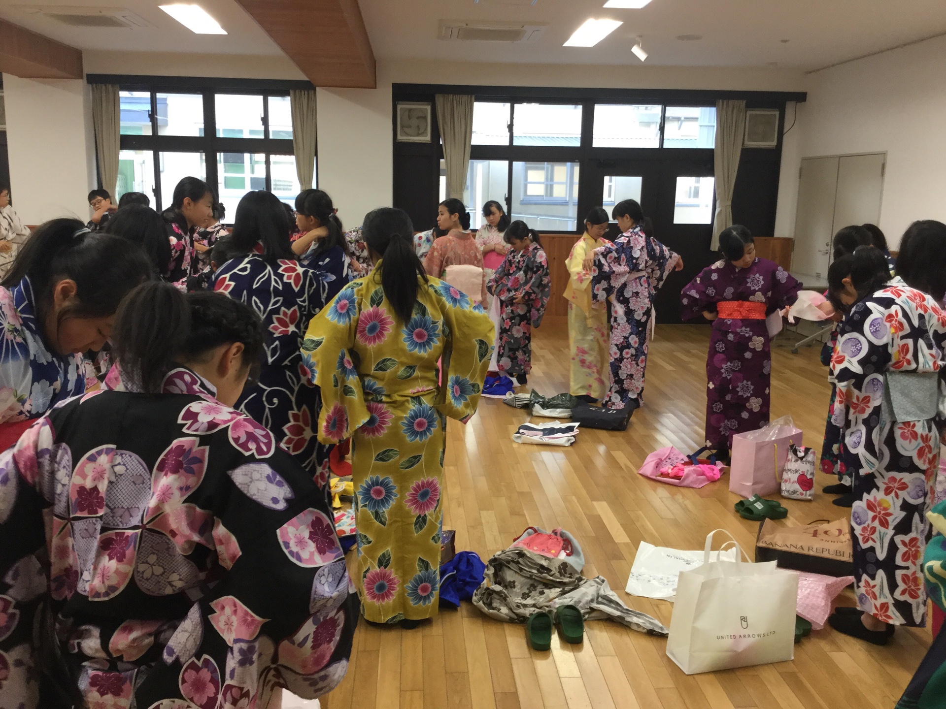 初日は、ほとんどの生徒さんが自分で浴衣を着るのが初めてで時間がかかってしまっていましたが、最終日にはほとんど自分達で着られるようになっていました。