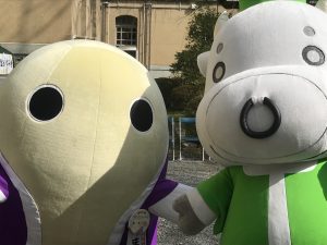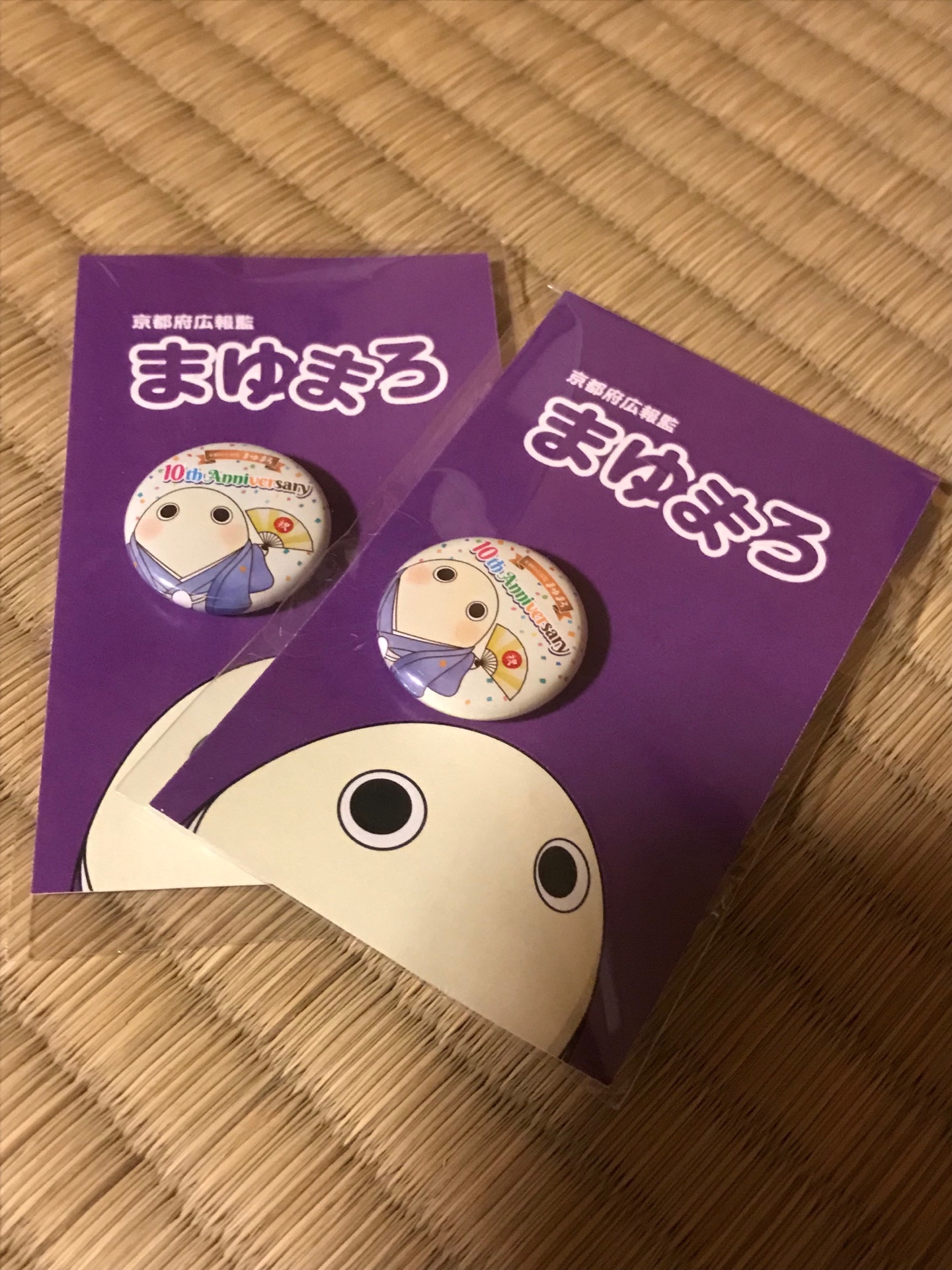 中庭ではまゆまろとかみぎゅうくんのパフォーマンスもあり、まゆまろは京都府の広報活動に携わって10年目を迎えるそうで、記念バッジをいただきました。