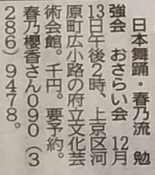 【お知らせ】京都新聞朝刊に「春乃流勉強会 おさらい会」が掲載されました