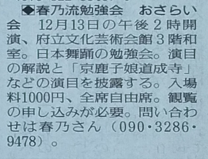 【お知らせ】読売新聞朝刊に「春乃流勉強会 おさらい会」が掲載されました