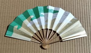 今年の扇は緑色と銀色と黄色を重ねた感じのもので、落ち着いた印象の扇でした。