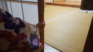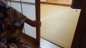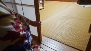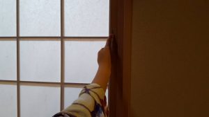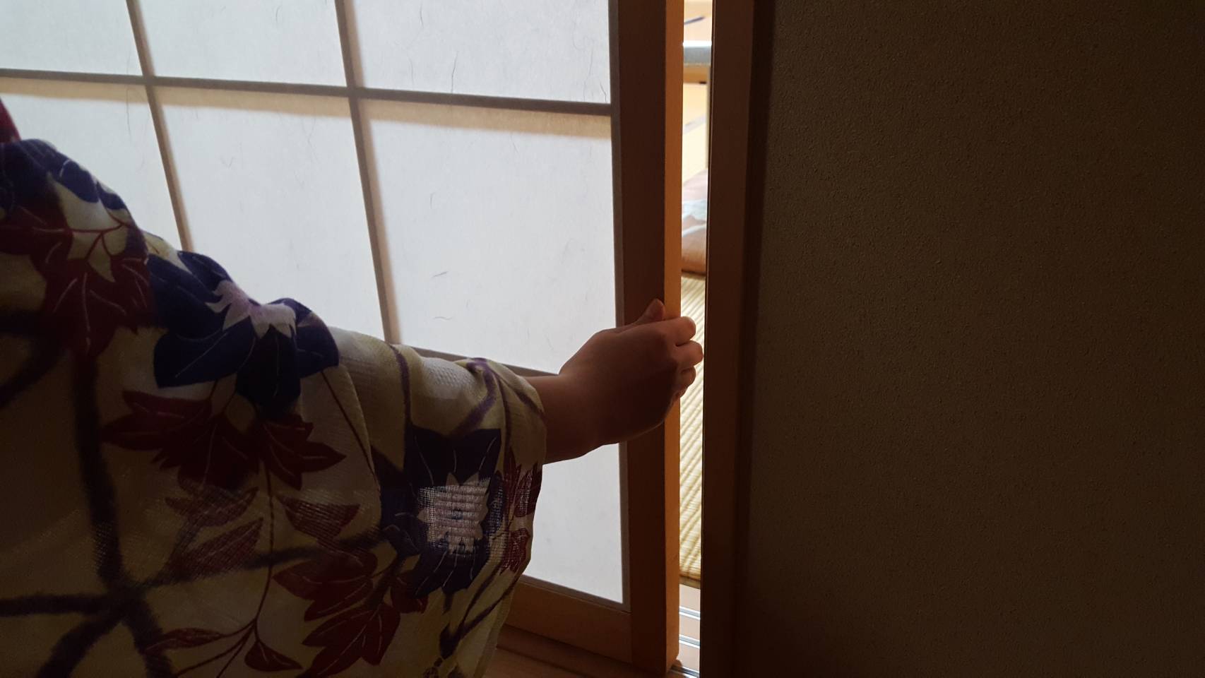 右手で引き手を取って10cmくらい開け、右手を襖に沿って腰くらいまで下ろし、自分の体の真ん中まで開け、左手に変えて端まで開けます。