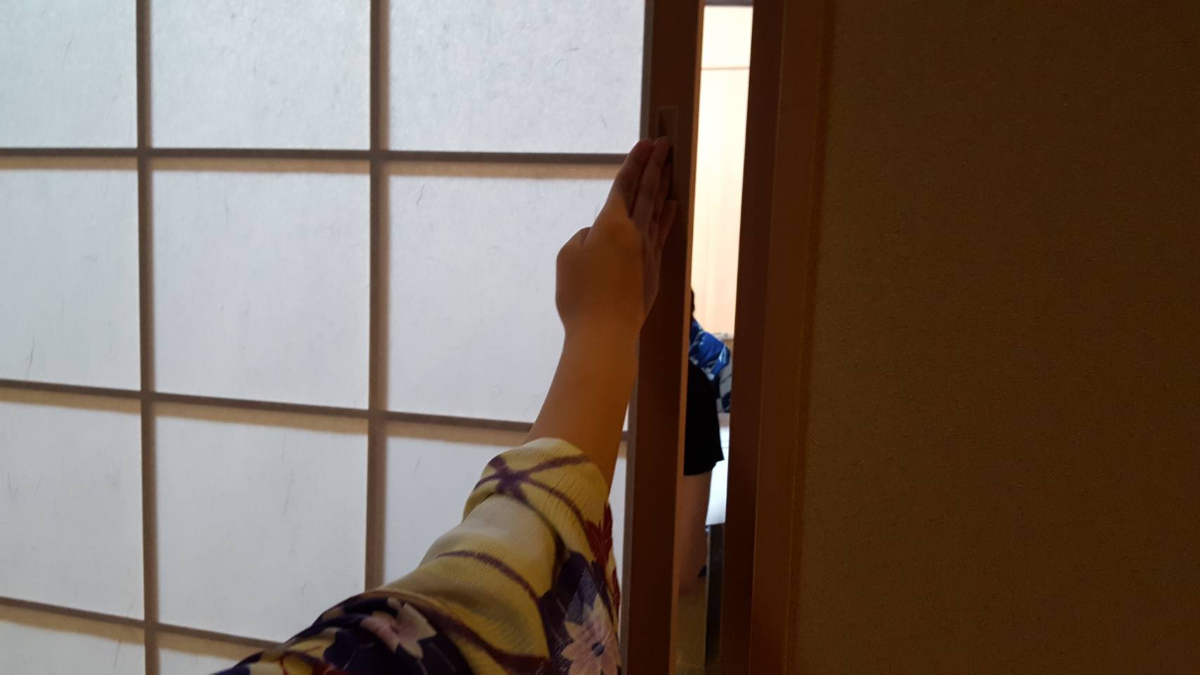 左手を逆手にして、腰ぐらいの高さで襖を持ち、自分の体の真ん中まで閉め、右手に変えて手が入るくらい